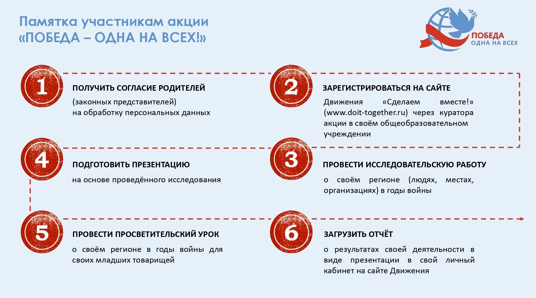 Акция предусматривает проведение исследовательской работы о своем регионе в военные годы с последующей подготовкой презентации с иллюстрированными материалами по результатам исследования, проведение тематических уроков и мастер-классов по тематике исследования с обучающимися, а также проведение иных мероприятий.