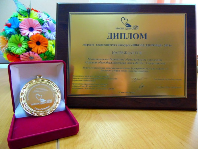 В рамках федерального конкурса «Школа здоровья – 2014» в Санкт–Петербурге МБОУ «СОШ №19» удостоена медали «За отличные успехи в области здоровьесбережения» и диплома «Школа здоровья -2014» за комплексную программу формирования культуры здорового и безопасного образа жизни учащихся «Здоровье»